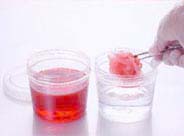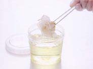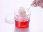 充分に着色したらB液から取り出し、再びA液に入れ余分な着色液を洗います。 このときA液はなるべく新しいものをお使いください。 ※ A液に長く浸け過ぎると色が落ちますので注意してください。 |